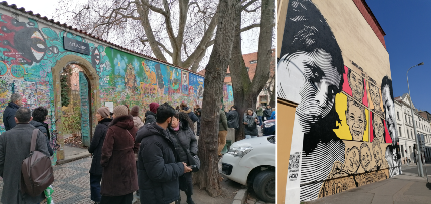写真左の「レノン・ウォール」は、1980年代から平和、愛、そして自由の象徴となっています。当初はジョン・レノンやビートルズにインスパイアされたグラフィティで埋め尽くされていましたが、時を経て、希望、団結、そして抵抗のメッセージを表現するための、色鮮やかで変化に富んだキャンバスへと進化しました。