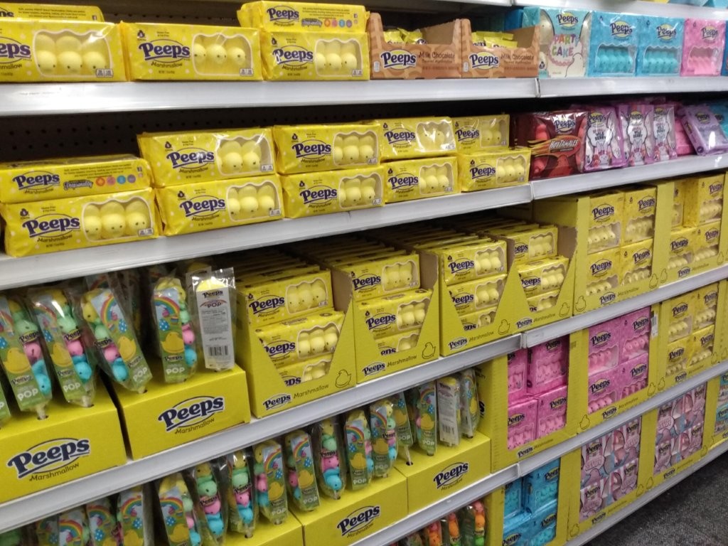さて、イースターが近づくにつれ、店頭に現れ始めるのが、ウサギとヒヨコの形をしたマシュマロのピープスたち。いっぺんに店頭が鮮やかになります。