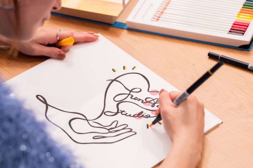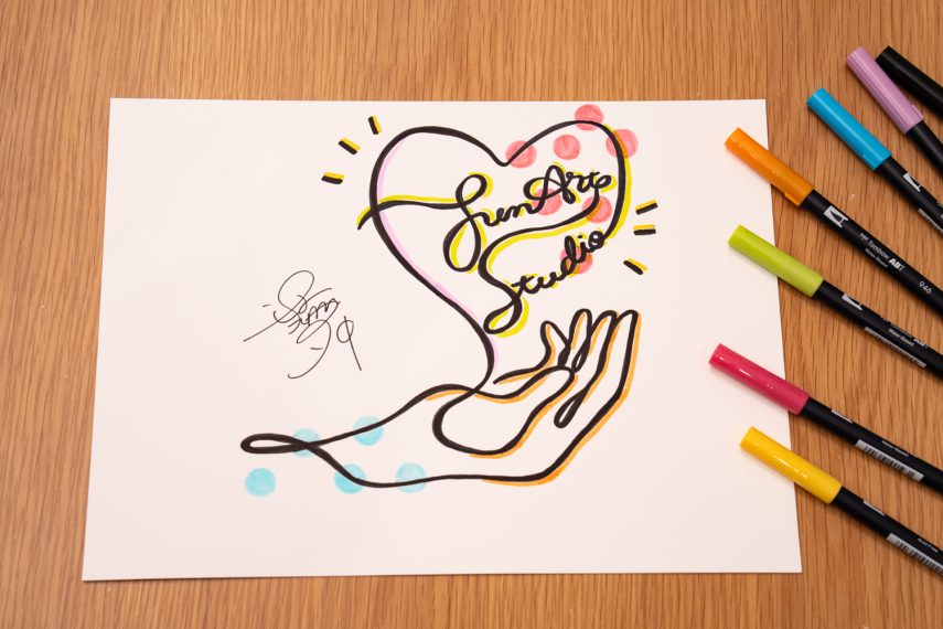 一筆書きで描いてみました。アートって手から生まれていくものだと思っていて、描いていたら自然とハートのモチーフが出てきたんです。FUN ART STUDIOの“FUN”という言葉からも、前向きなエネルギーとか、あたたかい空気を感じたので、そのまま線でつないでいくように描きました。今いちばん好きな色を使ったのもポイントですね。
