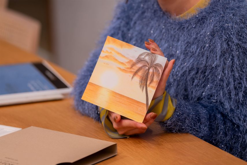 「色辞典」は色のバリエーションが本当に豊富だなって感じました。「この色が欲しい」と思ったときに、ぴったりの1本がすぐ見つかるんです。特に夕日を描くときは、蛍光色がすごく良い仕事をしてくれて。光の強さとか、反射の感じまで出せるんですよね。ヤシの木の影に使ったブラウンも、真っ黒ではなく柔らかな深みがあって、すごく気に入っています。芯の硬さも絶妙で、硬すぎず柔らかすぎず。画用紙が極端に凹むこともなく、指で少しぼかしたいときにも扱いやすかったです。描き心地のバランスがすごく良いなと感じました。