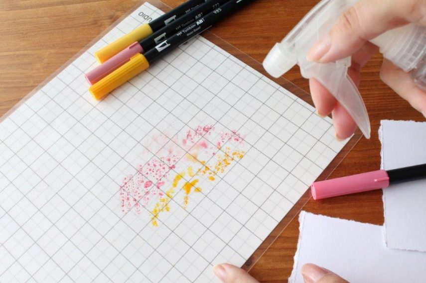 2. 白い紙を挟んだクリアファイルにABTを3〜4色ほど出し、霧吹きを吹きかけます。