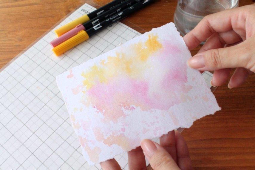 2.白い紙を挟んだクリアファイルをパレット代わりにして、ABTと水筆で色を作り、塗っていきます。まずは薄い色をベースに塗り、その上から色を重ねていくと、美しく仕上がります。