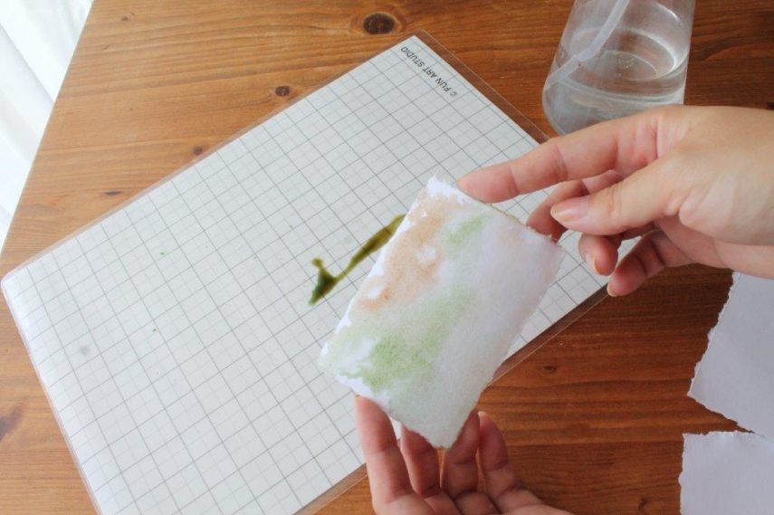 3.1でカットした画用紙を、2の面に押し付けて色をつけます。自然な風合いに色がつくのが魅力です。