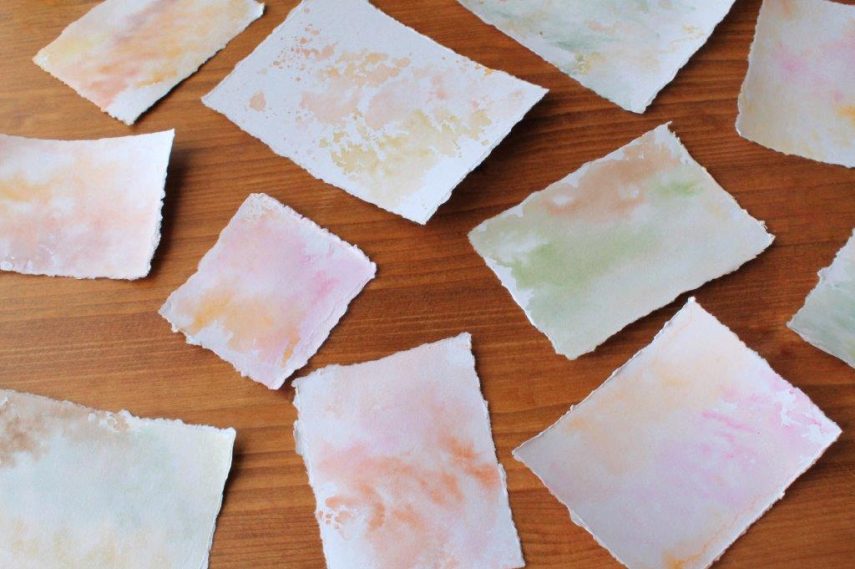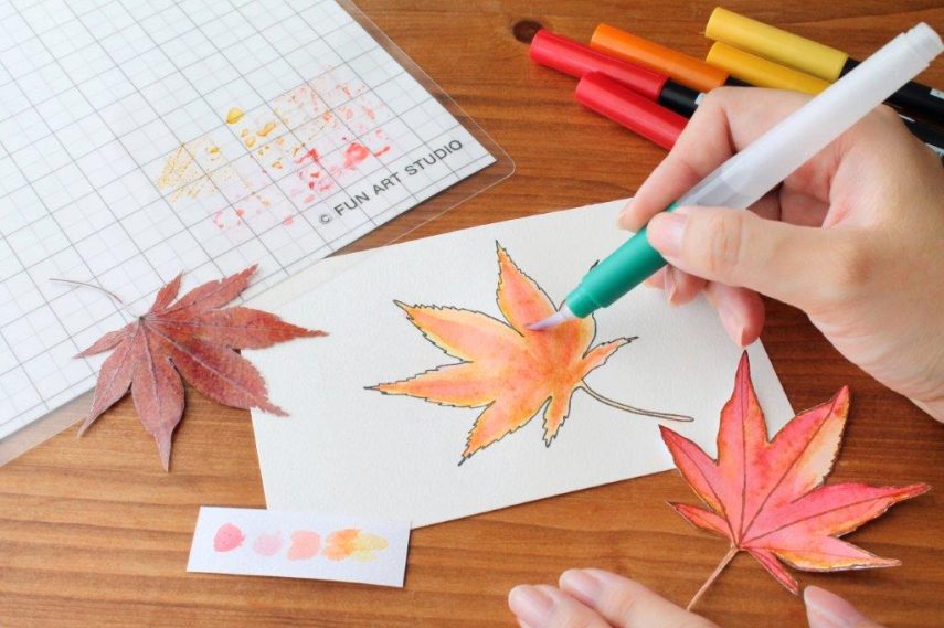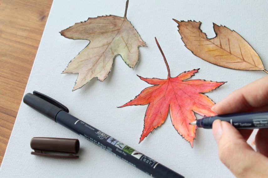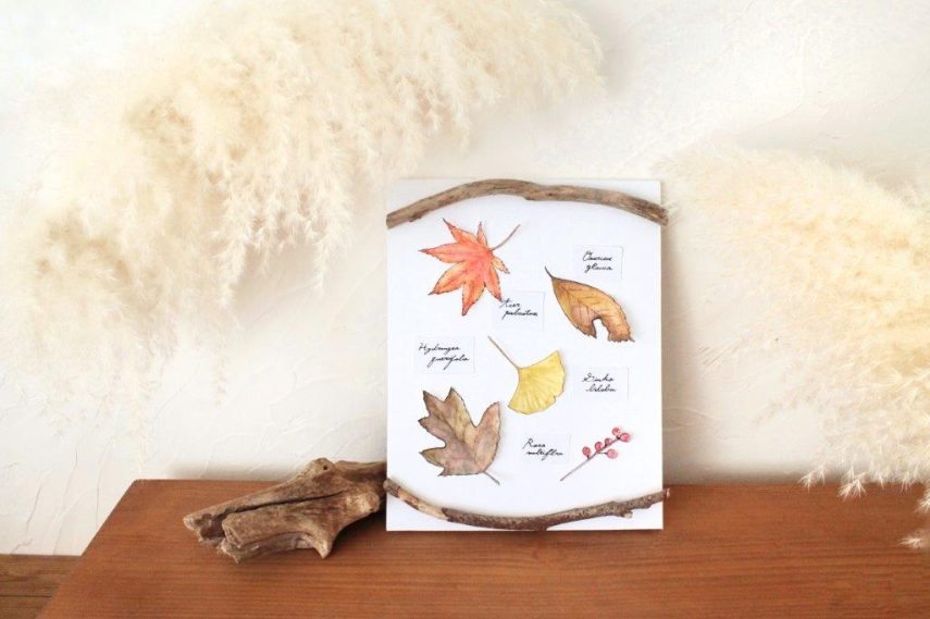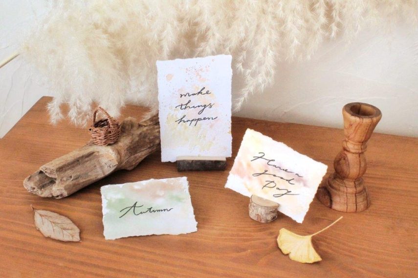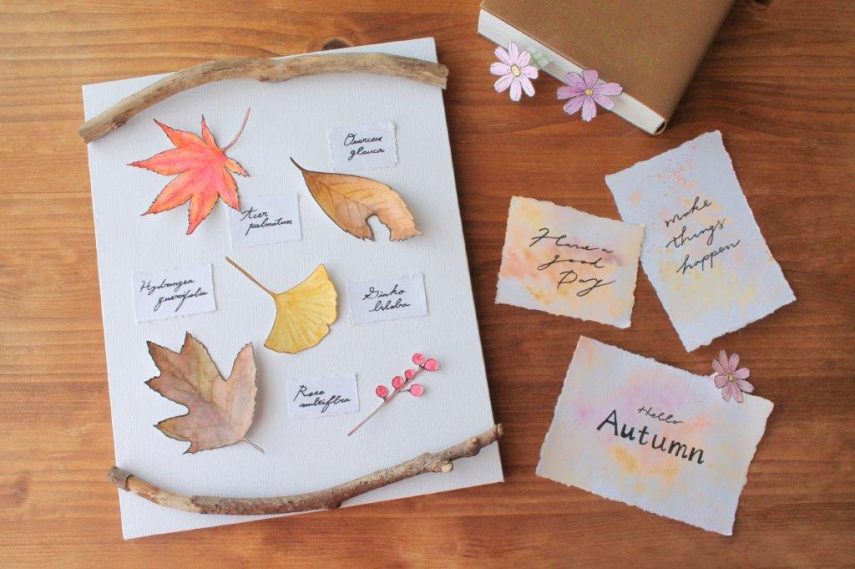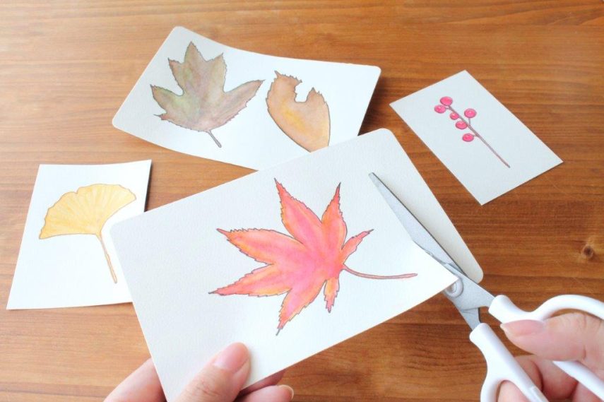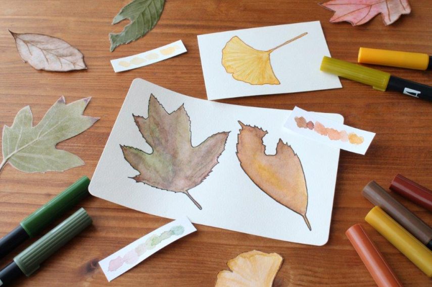 「何度も色を重ねることで、乾かすと紙が反ったりうねったりしますが、より落ち葉のように見えて素敵に仕上がるので、そのままの形を生かしてみてください」
