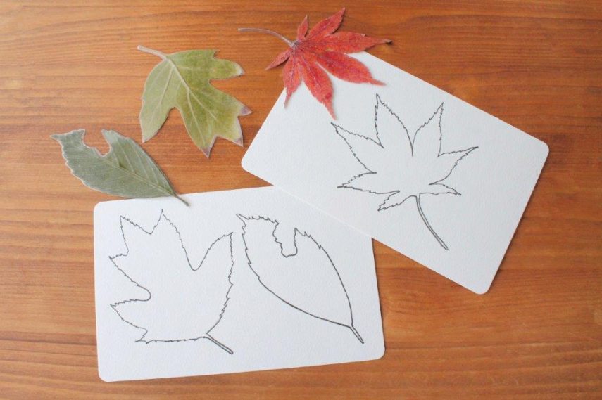 1.画用紙に草花の型を取ります。葉っぱのギザギザや所々欠けている部分もそのまま型取りすると、より自然な仕上がりになります。