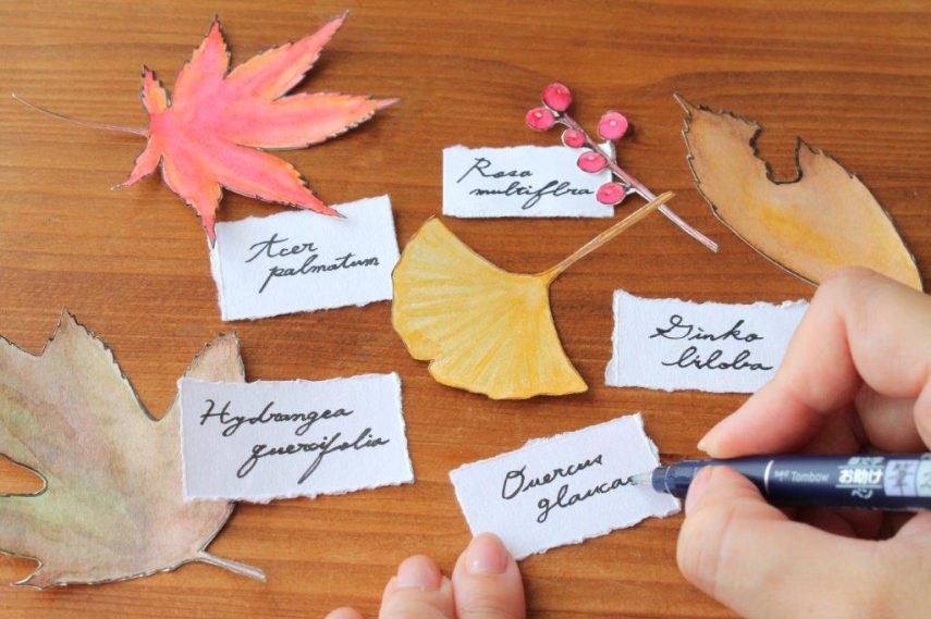 4.画用紙に学名(草花の名前)を書きます。学名を書く画用紙は、手でちぎって毛羽立たせて風合いを出すのがおすすめです。