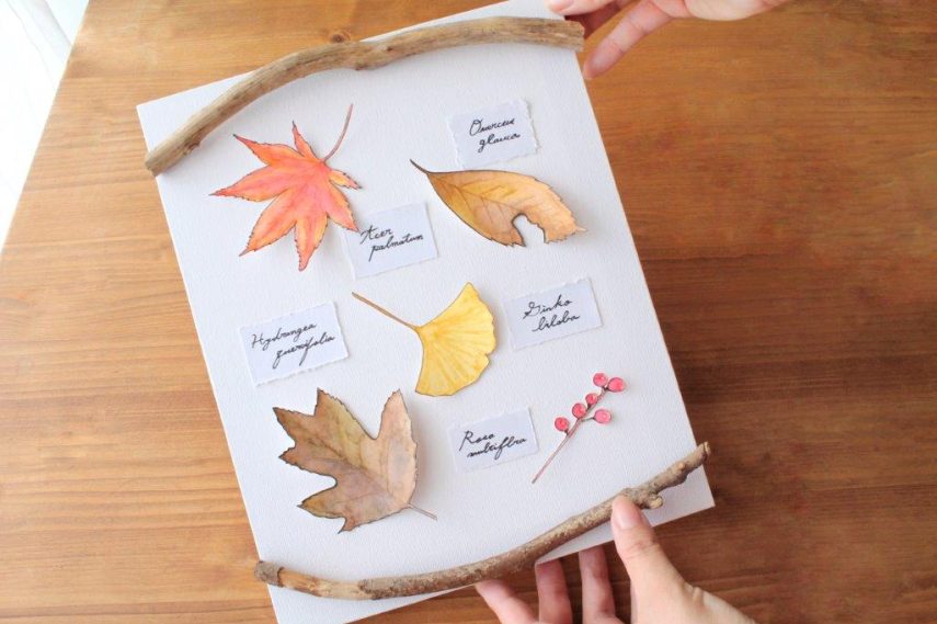 「乾かす過程で紙が反ったりうねったりしている場合は、無理に全面にのりを付けず、キャンバスに触れる部分のみ貼り付けると、本物の落ち葉のように立体感のある仕上がりになります」