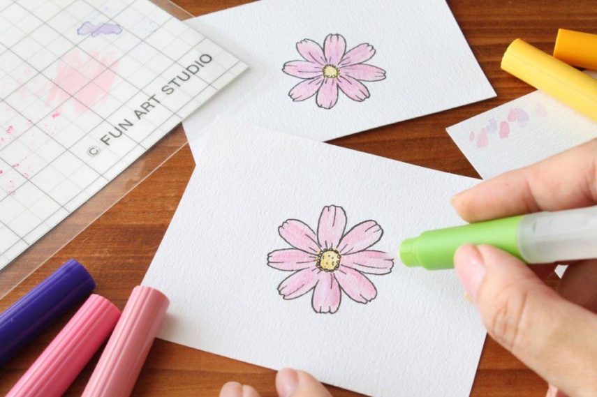 はじめに試し塗りをして、色を確かめながら塗るのもおすすめです。同じ手順で、他の草花も色を塗っていきましょう。