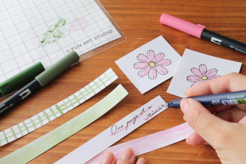 2.帯部分を作ります。約1cm幅でお好きな長さにカットし、1つのしおりにつき2枚の帯を準備します。帯には色を塗ったり、好きな模様を入れたり、フレーズを入れたりするのもおすすめです。