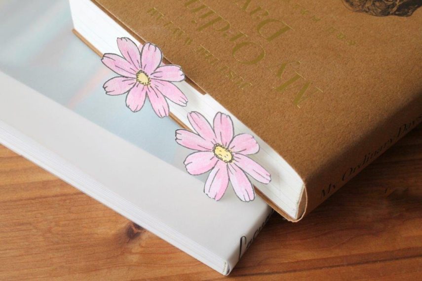 本の間から覗くお花がかわいい「コスモスのしおり」