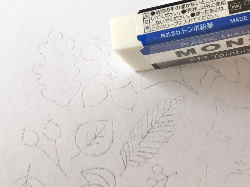4. 画用紙にうつった下絵を、消しゴムでこすらないようにトントンと線をたたき薄くしておきます。