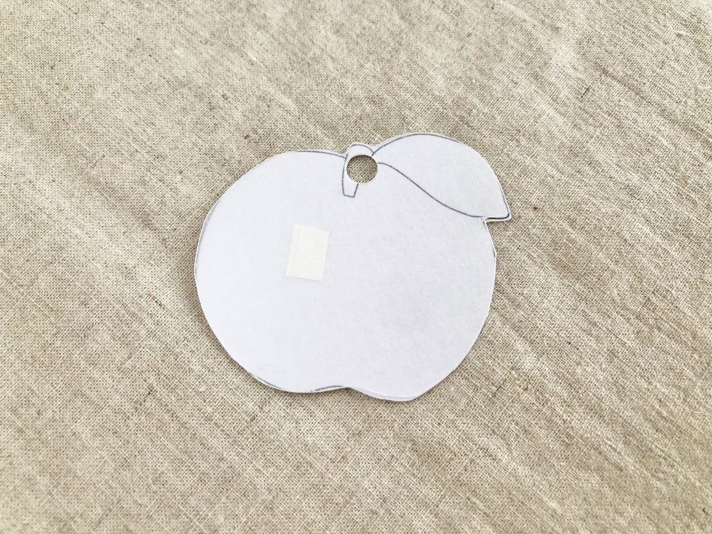 ②型紙を固定するため「りんご」の絵にマスキングテープを輪にして貼り付け、ツルツル面を下にしてプラバンを置き「りんご」の外側の線に沿ってハサミでカットします。