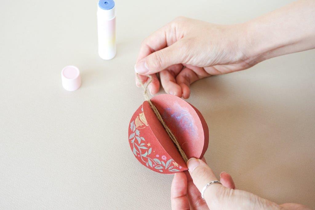 オーナメントの下側にひもが出るように、結び目やビーズなどをつけると、上からひもが抜けにくくなります。
