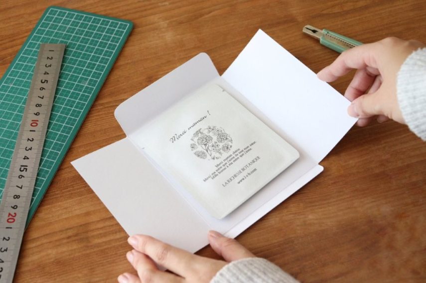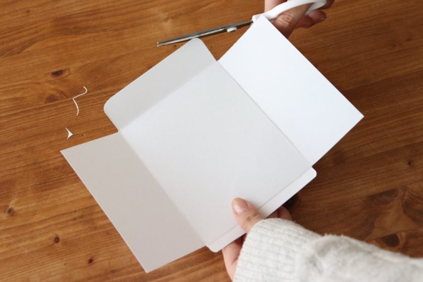 「角は丸くカットして整えておきます。折り筋に、刃を出さずカッターの背(金属の部分)に定規をあてながら引いておくと、最後に折って形を整えやすくなりますよ」