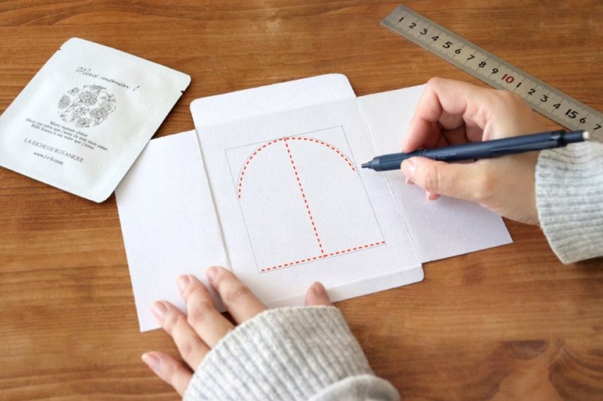 2. カードの窓枠部分を切り抜きます。窓枠の形になるよう下書きをして、赤線部分をカットします。曲線の部分はコップの縁を当てると綺麗に下書きできます。
