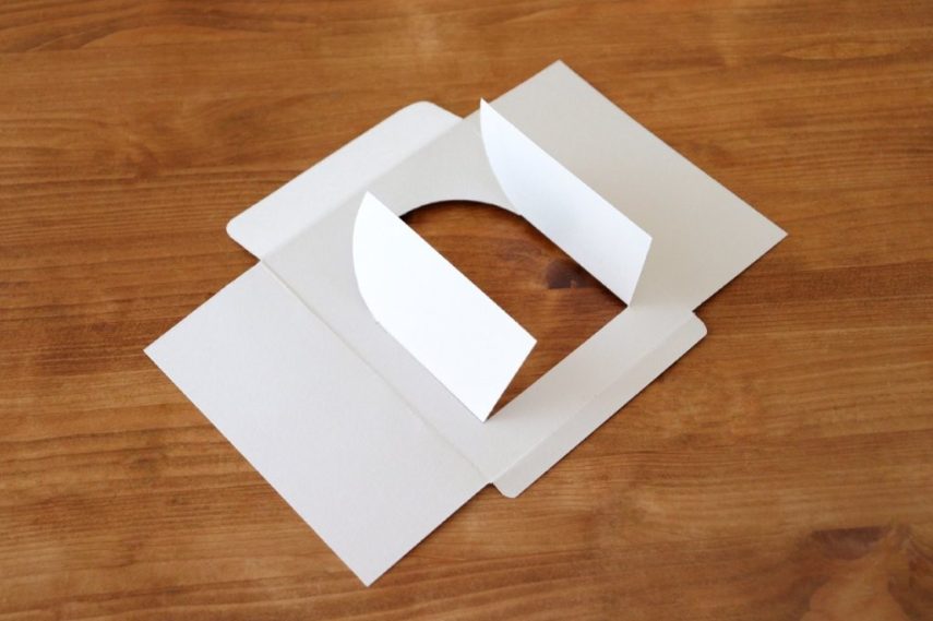 カットすると、このように扉が開く形に仕上がります。切り抜く前に書いた下書きは、ここで消しておきます。