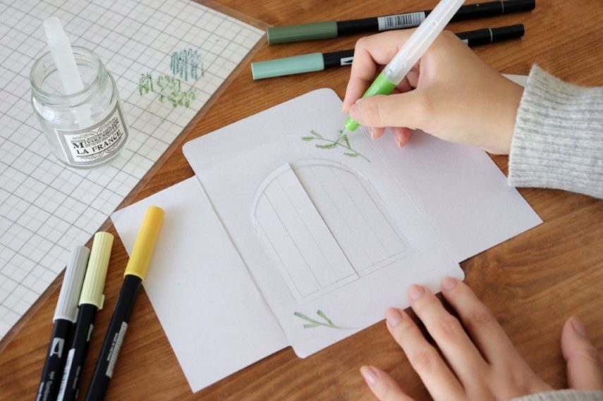 窓枠は木の扉をイメージして、薄いグリーン系のABTと水筆で色を塗ります。色を塗る前に木目の線を書いておくと、さらに味が出ます。色の濃淡を作ると、ナチュラルな木の色を表現できます。