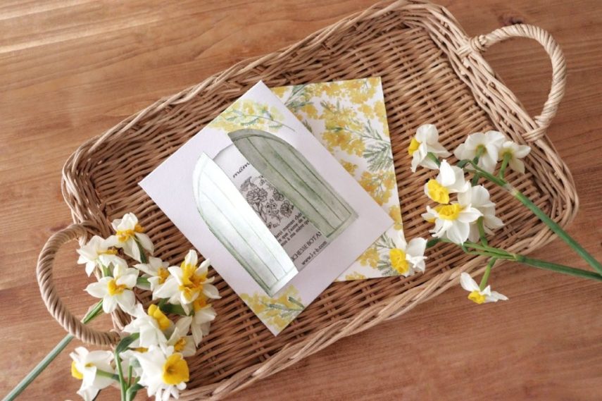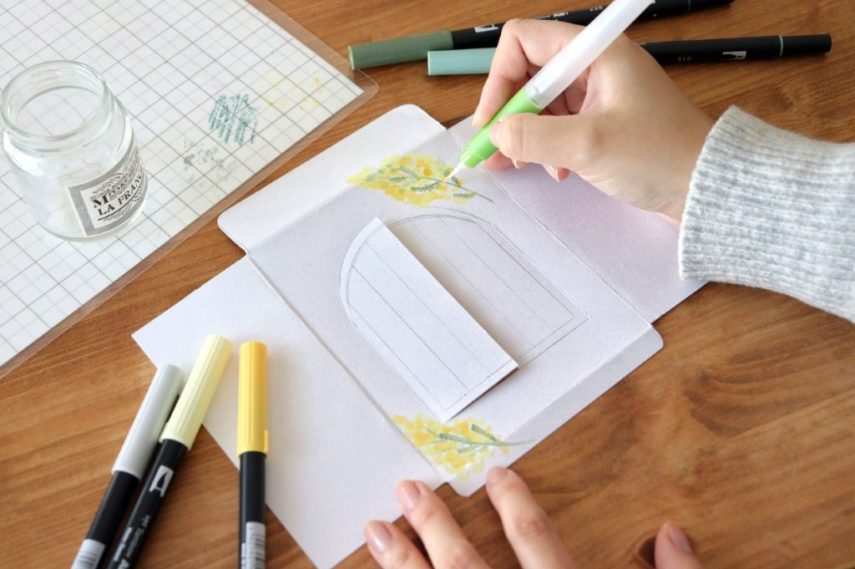 3. 窓の周りにミモザを描きます。まずは葉っぱから描いて、そのあとお花を描いていきましょう。花の色が濁らないよう、葉が乾いてから花を描きます。色が重なる部分は、水筆でぼかすと綺麗に仕上がります。