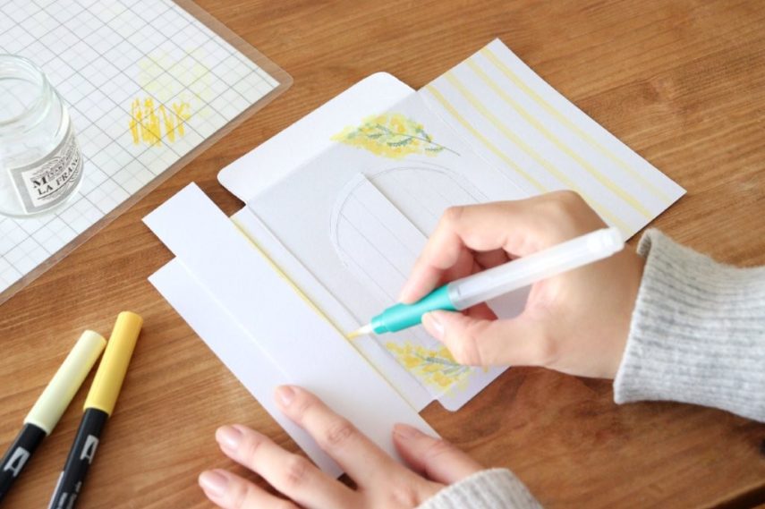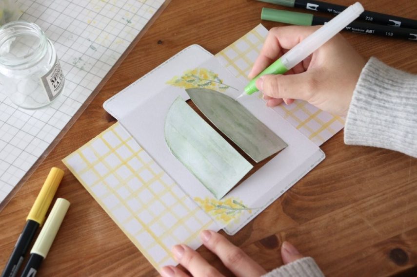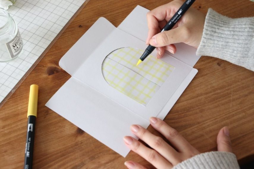 4. カードの裏面(左右の部分)には、イエローのABTと水筆でチェック柄を描きます。線はフリーハンドでも引けますが、水筆を使用する際は画用紙の切れ端を定規のように当ててあげると、水分量を調整しながら美しい線が引けます。