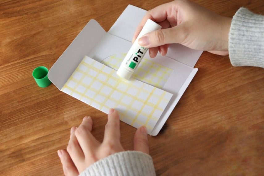 5. PiTスティックのりを、チェック柄を描いた面と底の部分に塗って折りたたむように貼り、乾いたら上の部分を折り入れて封筒型にします。