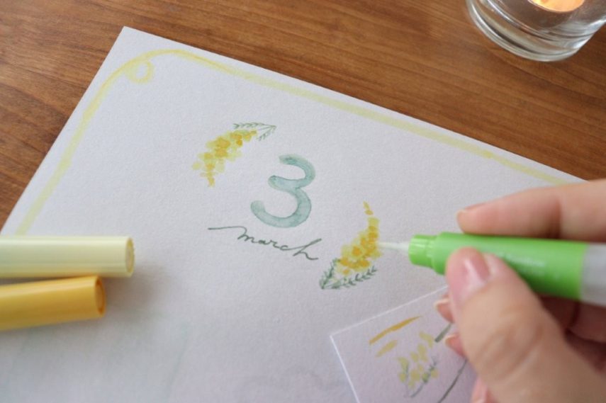 3.「3」の文字とミモザを左上に描きます。ABTと水筆を使い、色を少しずつ重ねるようにして描くと綺麗に仕上がります。