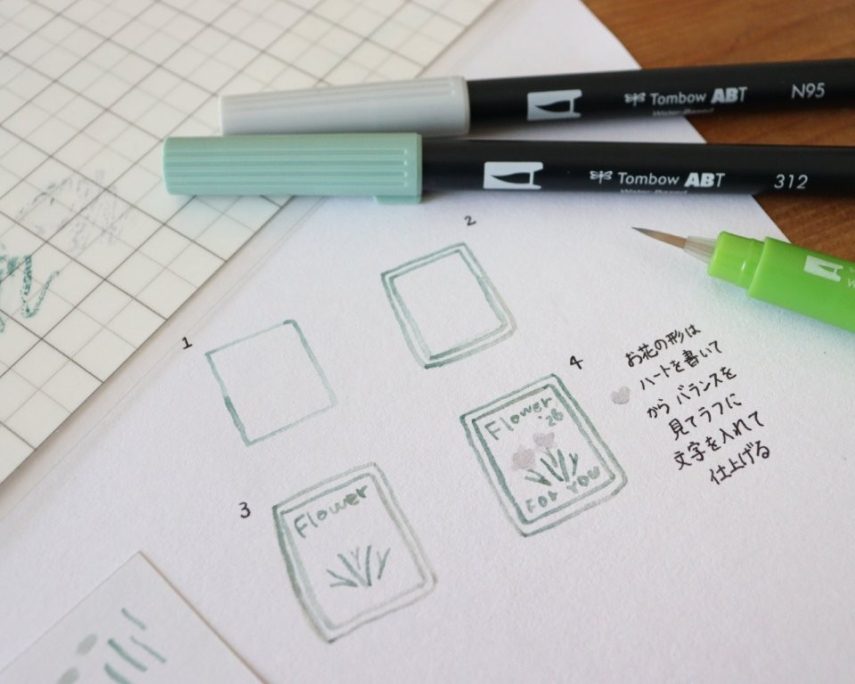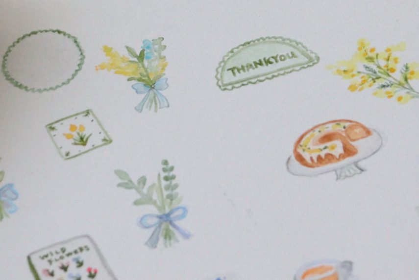 5. 続いて、別の紙に好きなイラスト描いてシールを作ります。イラストを描くときは木物語、ABT、水筆を使い、まずモチーフの形をラフに描き、徐々に濃い色を重ねていくと綺麗に仕上がります。参考に、2つのイラストの描き方をご紹介します。