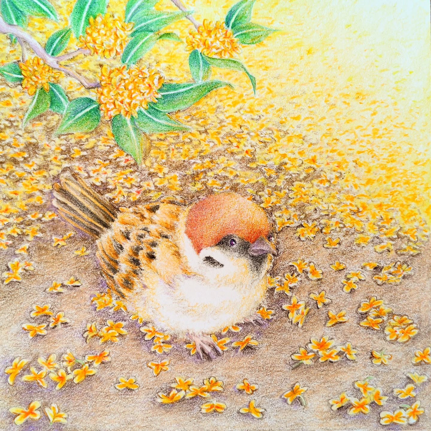 描いた頃ちょうど金木犀の花が満開の時期で、香りが庭に漂っていました。子供の頃からこの香りが好きで、落ちた花を集めてポプリを作った思い出があります。咲いている時の香りそのままには再現出来ませんでしたが、オレンジの小花を詰めた小瓶はとっても可愛く出来ました。
