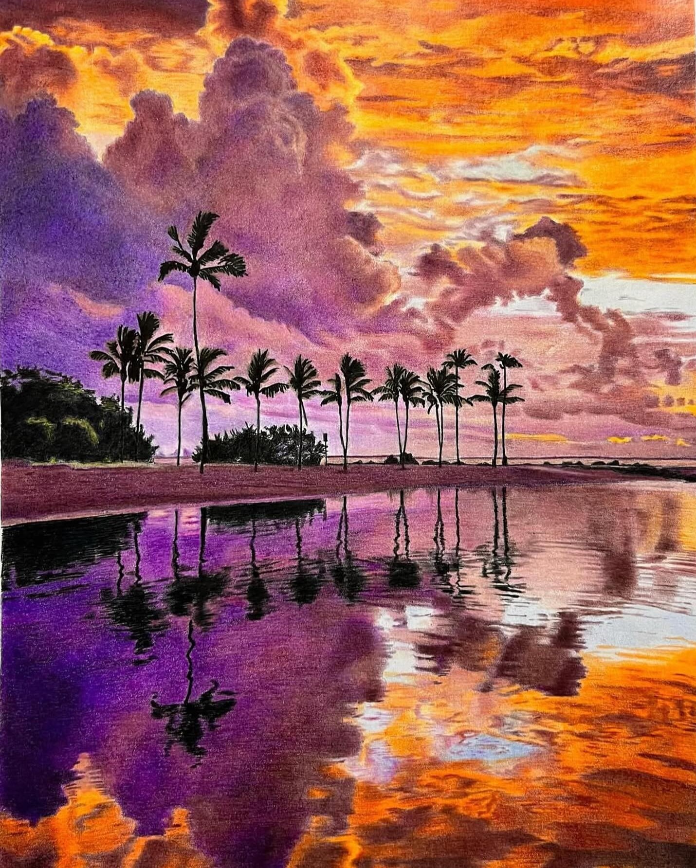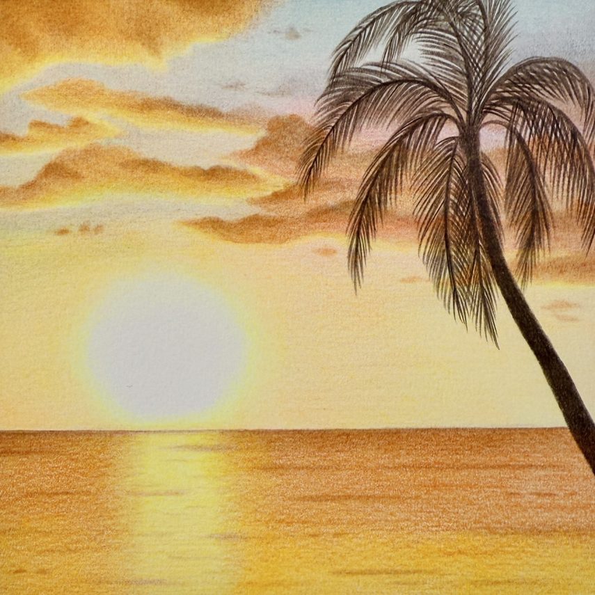 この絵は私の夏のオレンジ色の思い出、ハワイで見た夕焼けを描きました🌅