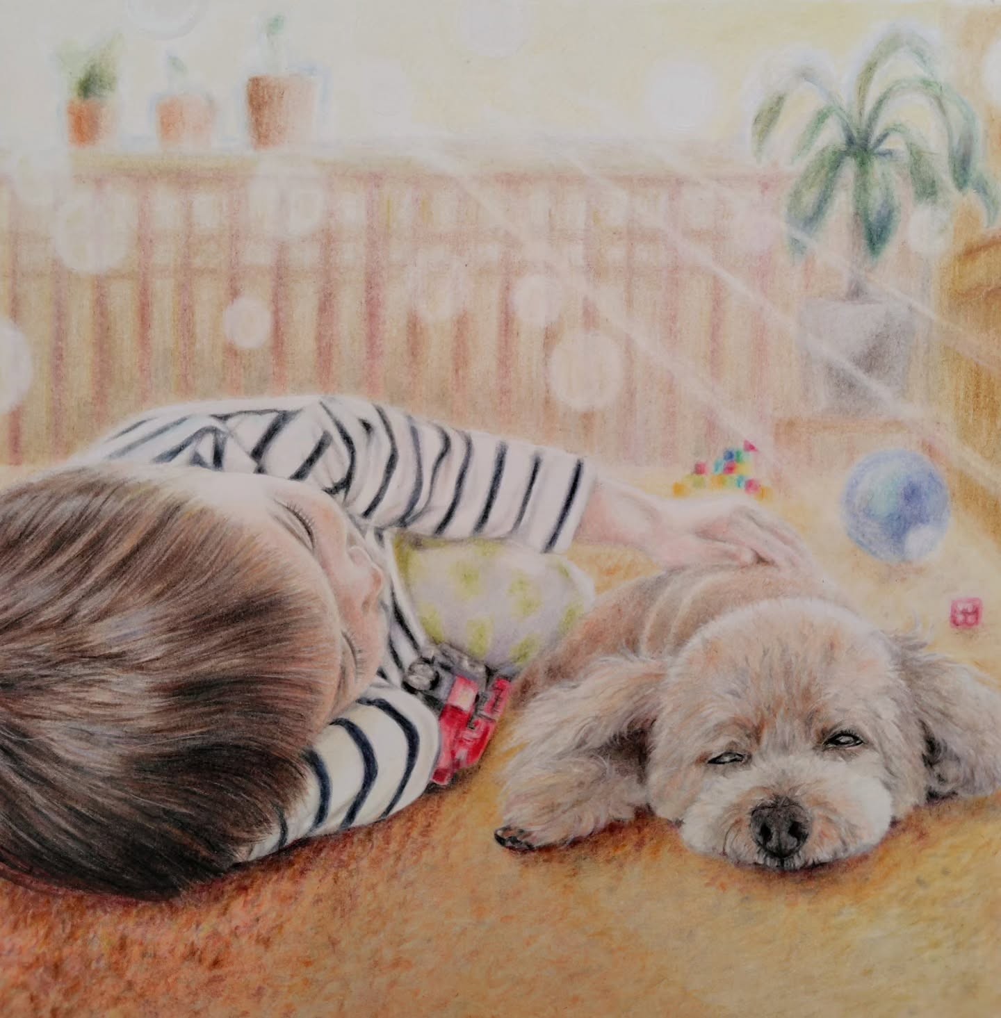 息子がまだ幼かったあの頃。10月の穏やかな午後にのんびりお昼寝中。誰にもじゃまされることなく、おもちゃもわんこもひとり占め。日差しがぽかぽか暖かく何気ない平和な日常は、私の大切なオレンジ色の思い出です。