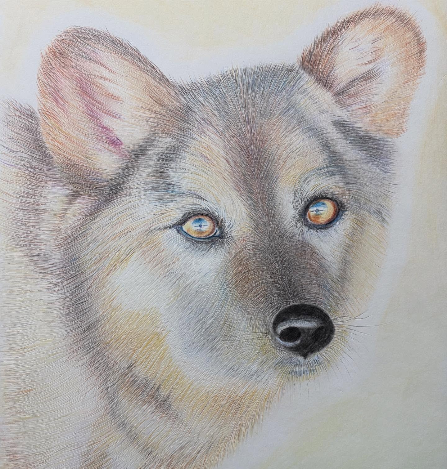毛並みの1本1本の描写が非常に繊細で丁寧です。特に目の輝きが美しく、見る人を瞬時に瞳に引き込むような魅力があります。とてもあたたかい愛情に包まれていたことが伝わる絵です。