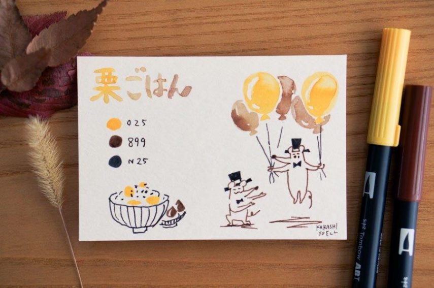 栗ごはんの鮮やかな栗の黄色(025)、栗の皮のブラウン(899)、胡麻のダークグレー(N25)の配色。