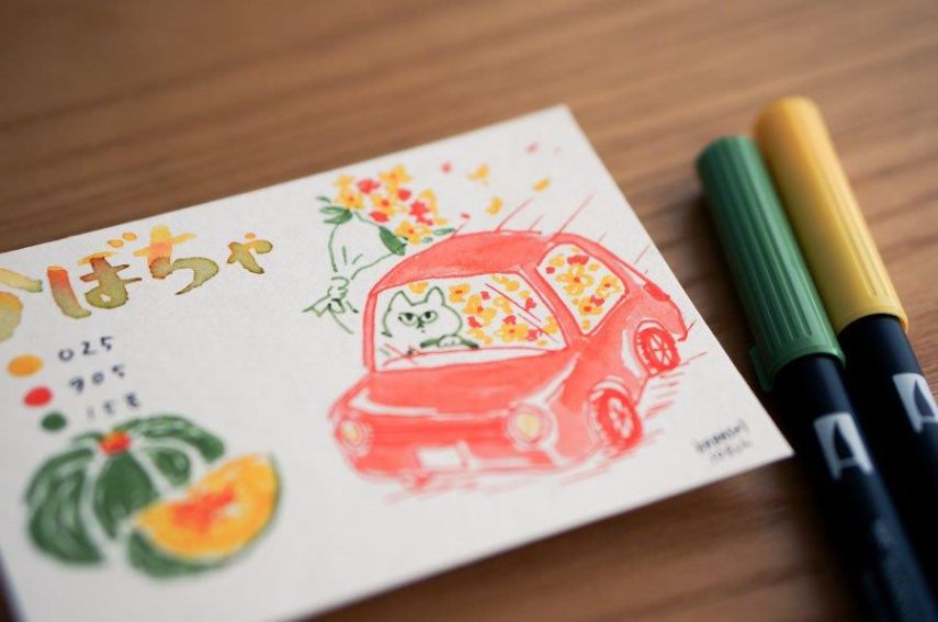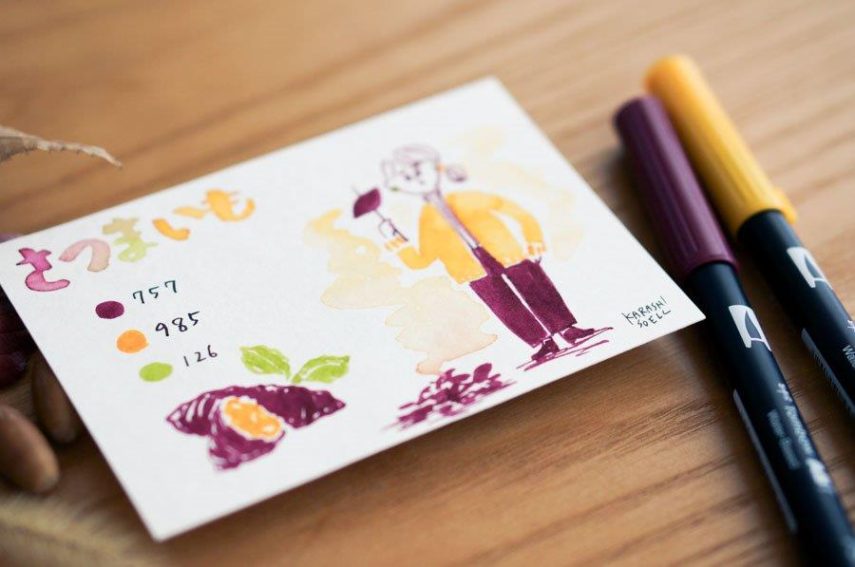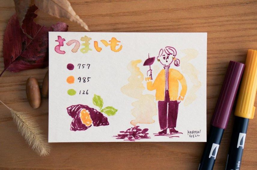 焼き芋用の落ち葉と、そこから出る煙を水筆で滲ませてグラデーションにし、さつまいものいい香りが漂ってきそうな色合いにしてみました。
