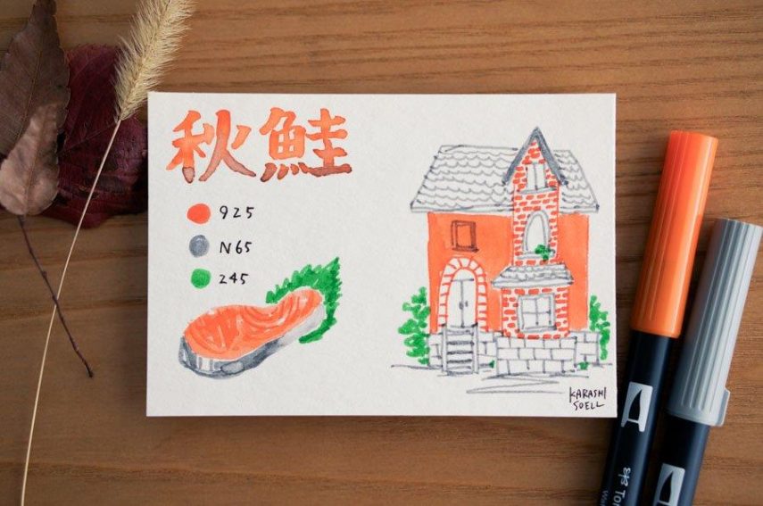 鮭の配色を建造物のイラストに充てた「秋鮭ハウス」が描けました。