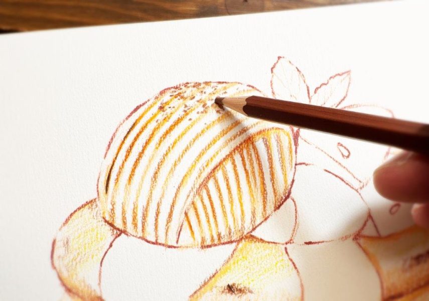 今回のようなふわふわ素材のパンケーキは、黄系の色鉛筆をたくさん使うため、グラデーションを表現しやすく、また色鉛筆の芯が柔らかくて濃淡がつけやすい『木物語』を選びました。