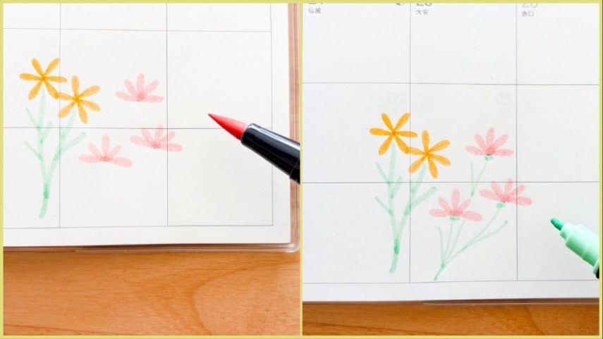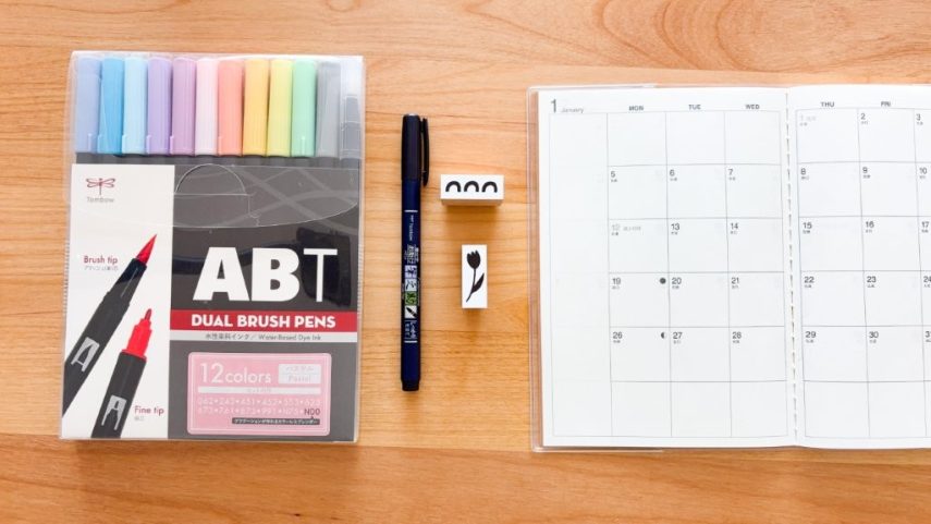 パステルカラーのABTを使って、春らしい手帳のマンスリーページを作ります。筆芯・細芯両方を使って簡単な模様やイラストを描くと、開くのが楽しみになるページが出来上がります。