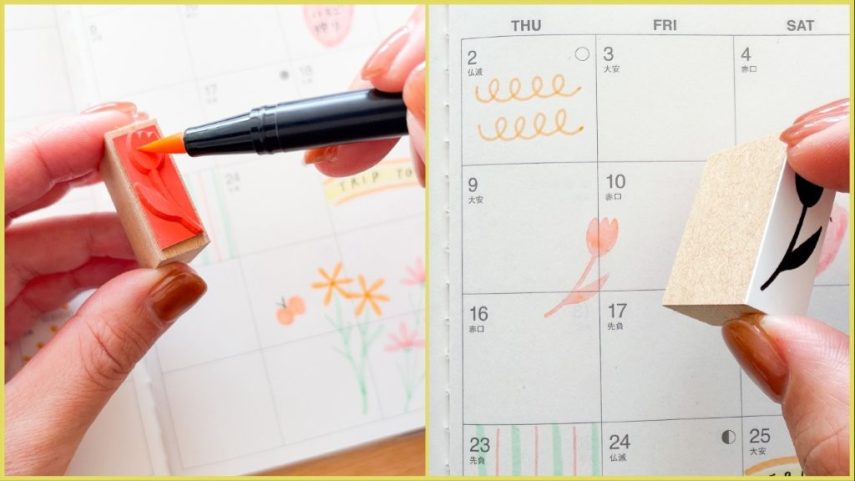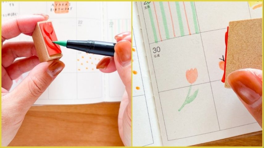 ABTはスタンプのインクとしても使えます。筆芯でスタンプの印面をしっかり塗って、手帳の余白に捺せば簡単に手帳を華やかにできますね。
