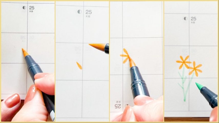 ABTの筆芯を寝かせて少し強めに押し付けると、ドロップの形が描けます。このドロップを1周ぐるりと描いて、お花にします(手帳を回して描くと描きやすいです)。お花を二つ描いて、茎と葉を描きます。(使用カラー:991/243)