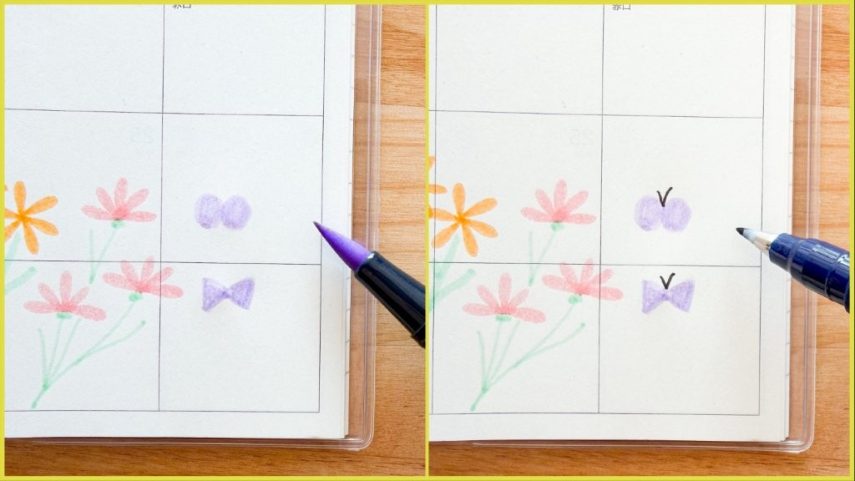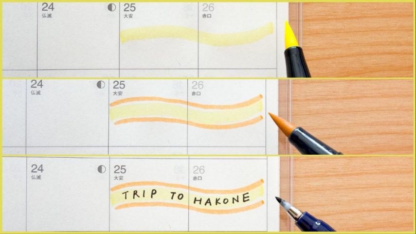 ABTで描いたイラストの上に、筆之助(しっかり仕立て)で予定を書くと見やすく、楽しくなります。筆先に適度に硬さのある「しっかり仕立て」は文字も書きやすいです。