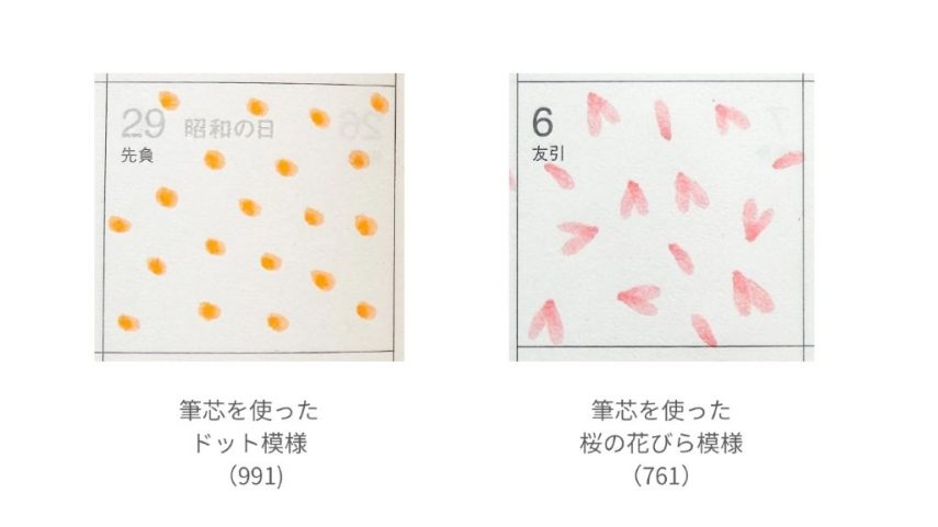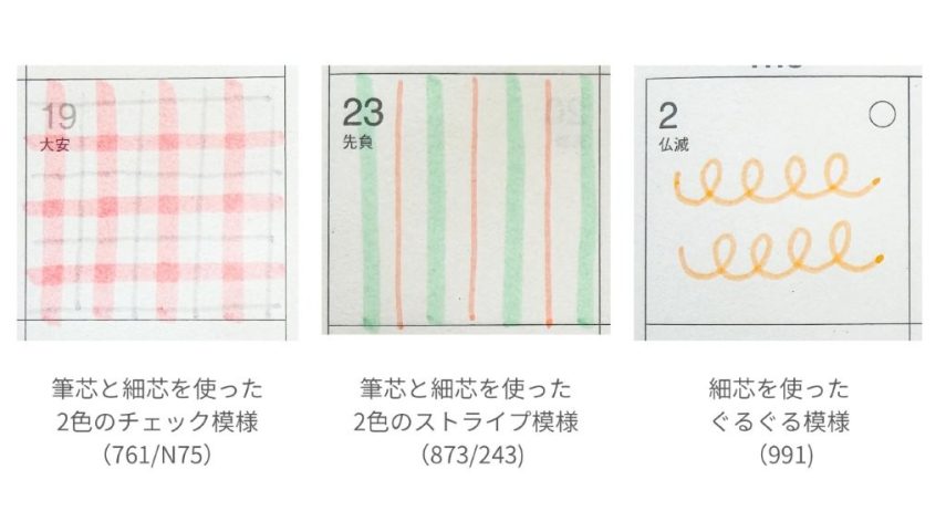 予定がある日は模様の上から書くことができ、書き込む予定がなくなんとなくページが寂しいときも、模様を描くだけで余白がかわいく埋まります。