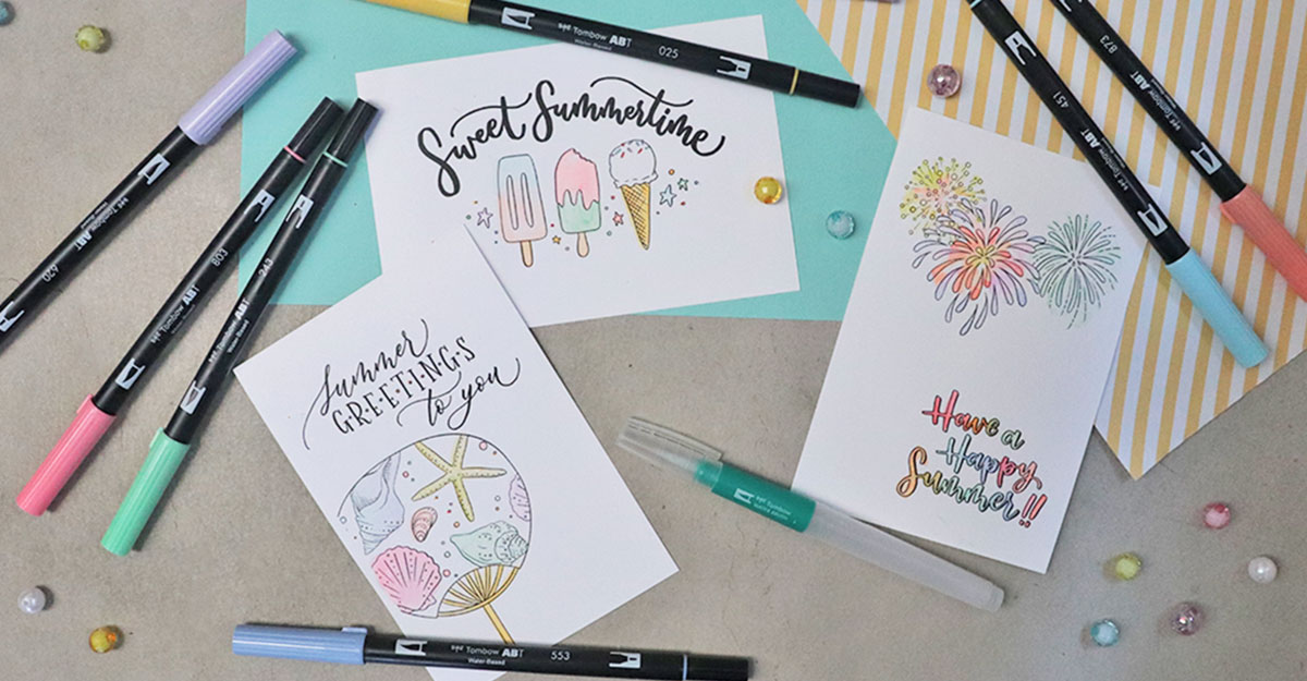 Arts&Crafts Ideas 2021.8.2 ABTと水筆を使って涼し気に。簡単可愛い暑中見舞いを作ろう|無料テンプレート #ABT#水筆#アイスクリーム#うちわ#カード#サマーカード#暑中お見舞い#テンプレート#花火#ARCH DAYS