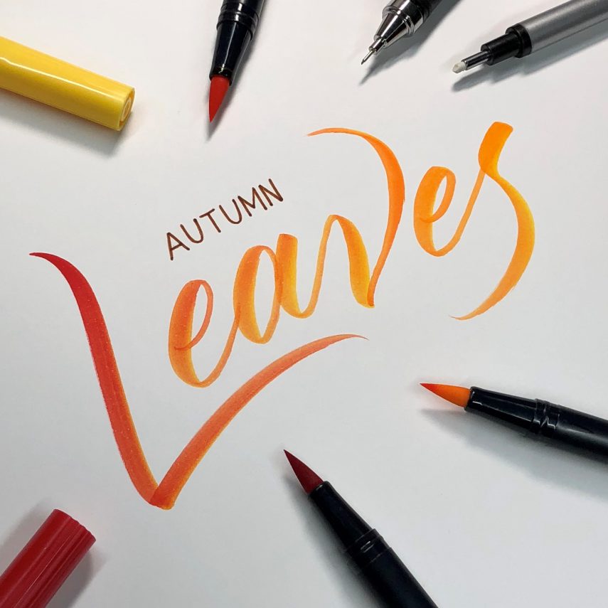 紅葉の色でグラデーションをつけて描いてみました。 レッドとオレンジをパレットにのせ、イエローでレッドとオレンジの色をすくって描いています。